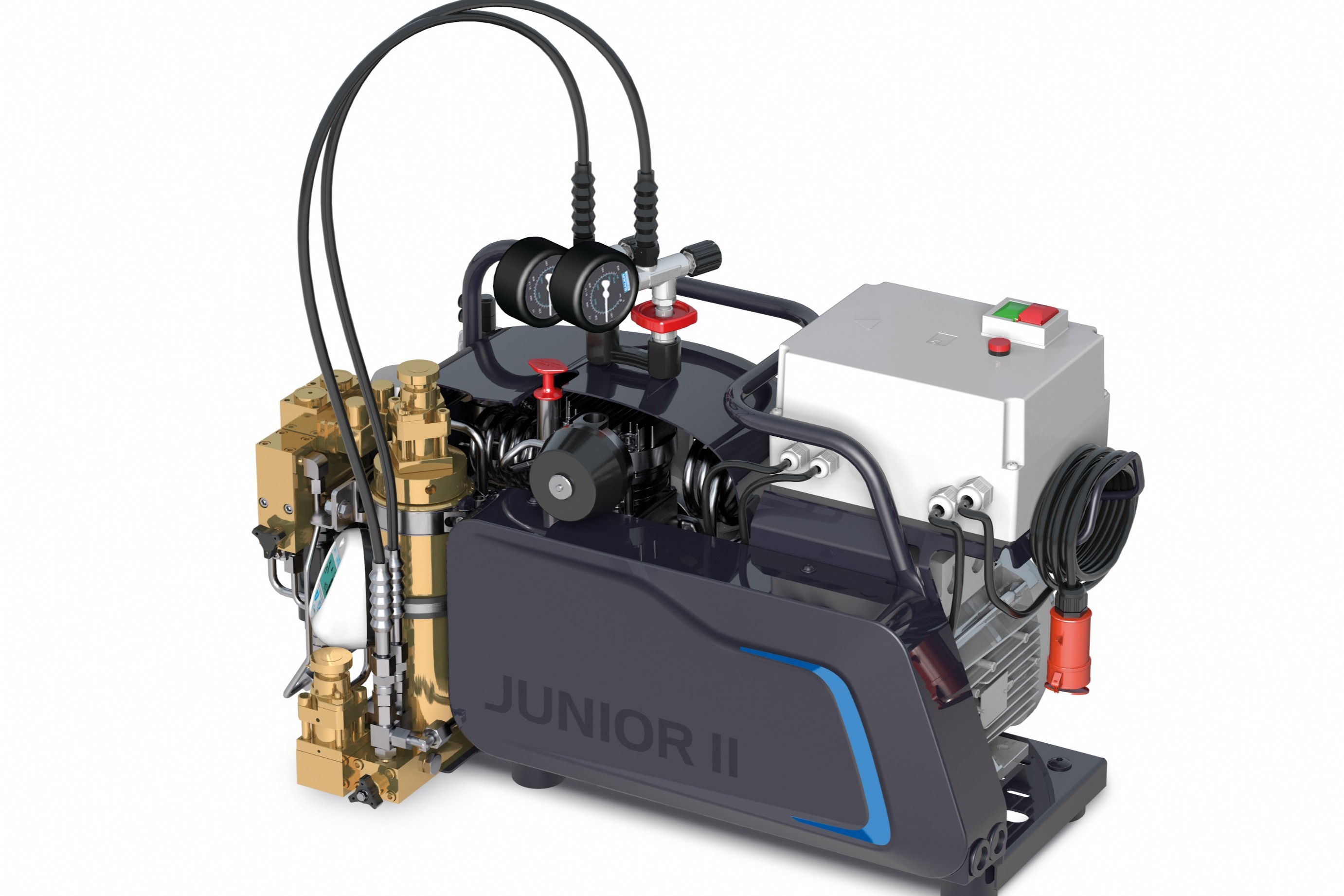 Junior II tilbyder nu et endnu mere kompakt design og talrige detaljerede forbedringer. BAUER’s patenterede og verdensførende TRIPLEX® filtersystem garanterer samtidig, at kompressoren leverer den reneste åndeluft i henhold til DIN EN 12021