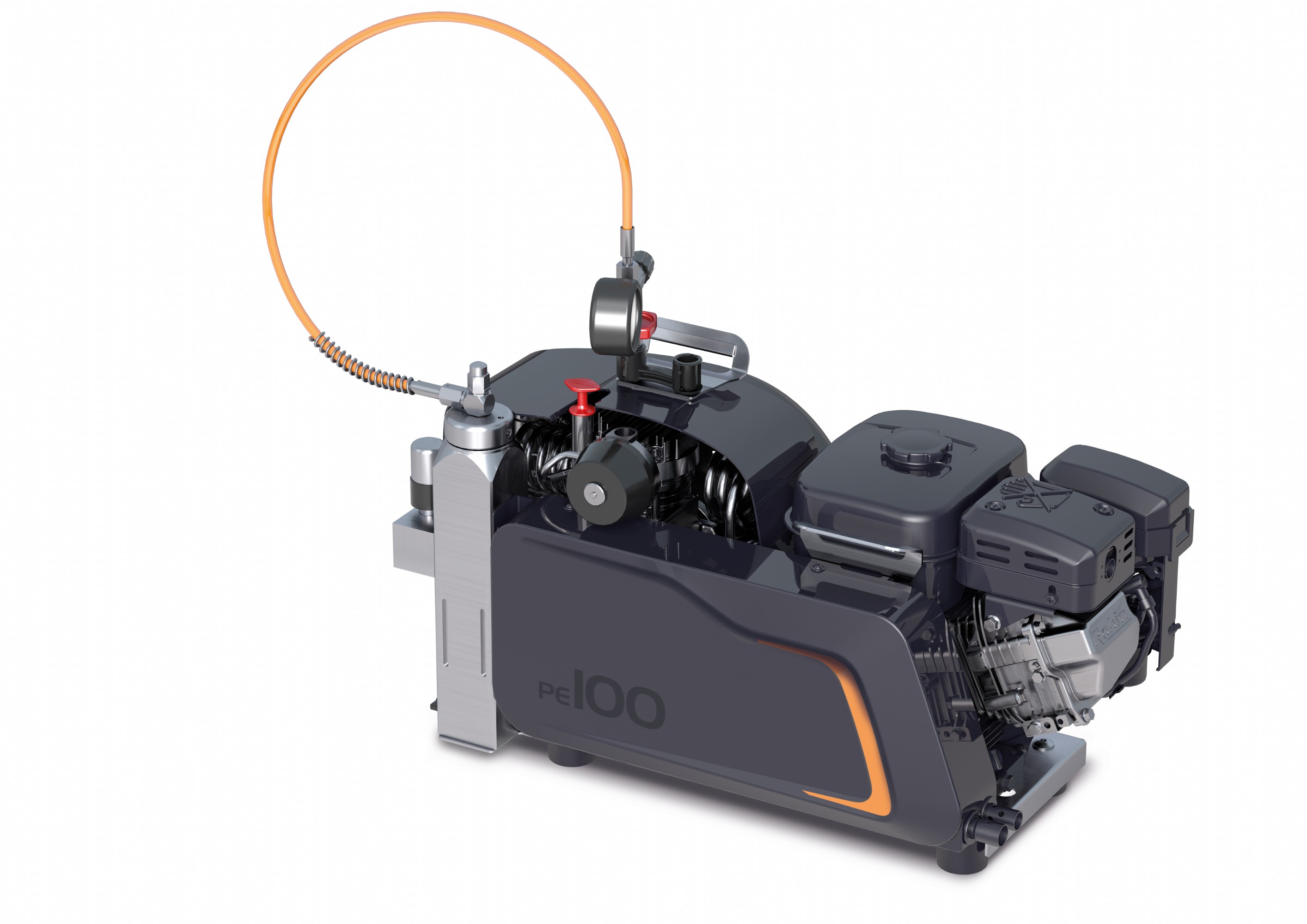 Højtrykskompressorblokken er hjertet af PE-100 kompressoren. Igennem årtier har denne blok vist dens værd, med mere en 100.000 solgte blokke.Den nemt tilgængelige olie-påfyldningsstuds og olieafløb, gør det meget nemt at skifte olie på kompressoren. Ved hjælp af en en oliepind kan oliestanden let kontrolleres. De lange intervaller imellem olieskift, samt de slidstærke stempelringe nedsætter driftsomkostningerne til et minimum.
